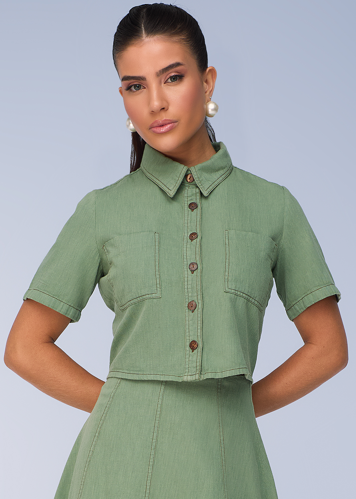 Apresenta colarinho tradicional, mangas curtas e fechamento frontal por botões amadeirados, que adicionam charme ao visual. Os bolsos frontais funcionais reforçam o estilo utilitário, tendência forte da temporada.