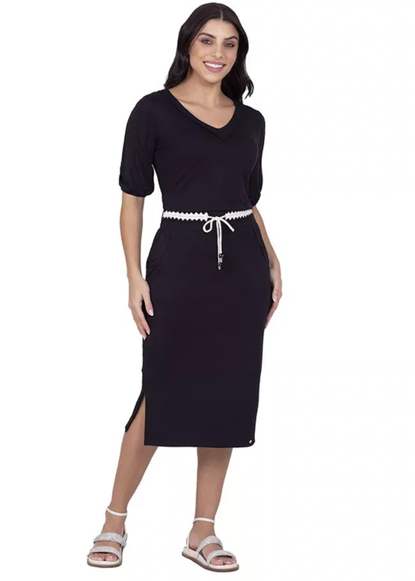 A saia apresenta elástico interno na cintura, guipir com cordão de amarração no cós e bolsos frontais funcionais, unindo praticidade e estilo. O modelo conta ainda com fendas laterais, shape justo, comprimento midi e forro, oferecendo segurança, elegância e conforto ao vestir.