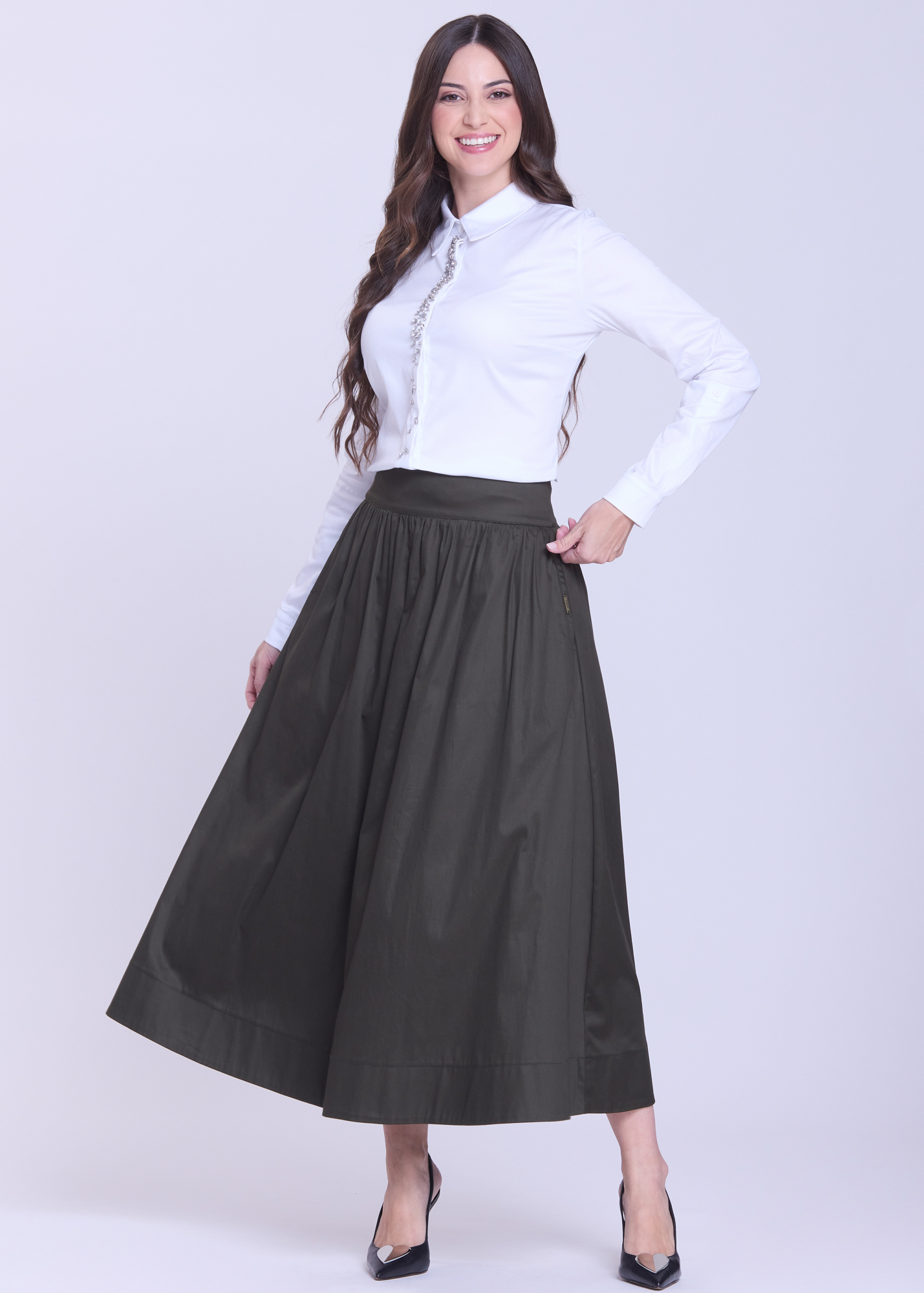 A Saia Hapuk na cor verde é a escolha ideal para quem busca um visual sofisticado e versátil, sem abrir mão do conforto. Confeccionada em tecido leve e de excelente caimento, a peça proporciona toque macio e fluidez ao caminhar.
