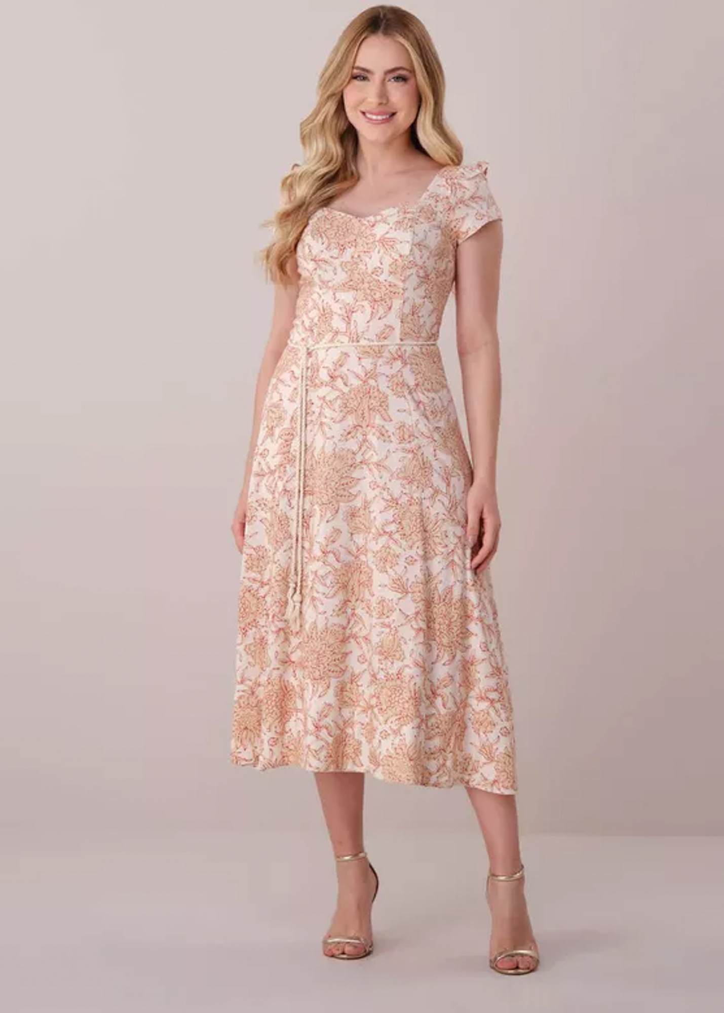 A modelagem maxi midi levemente evasê garante movimento e equilíbrio ao visual, enquanto o decote princesa valoriza o colo com suavidade e romantismo. As mangas curtas estruturadas complementam o design com charme delicado, e o recorte na cintura realça a silhueta de forma natural.