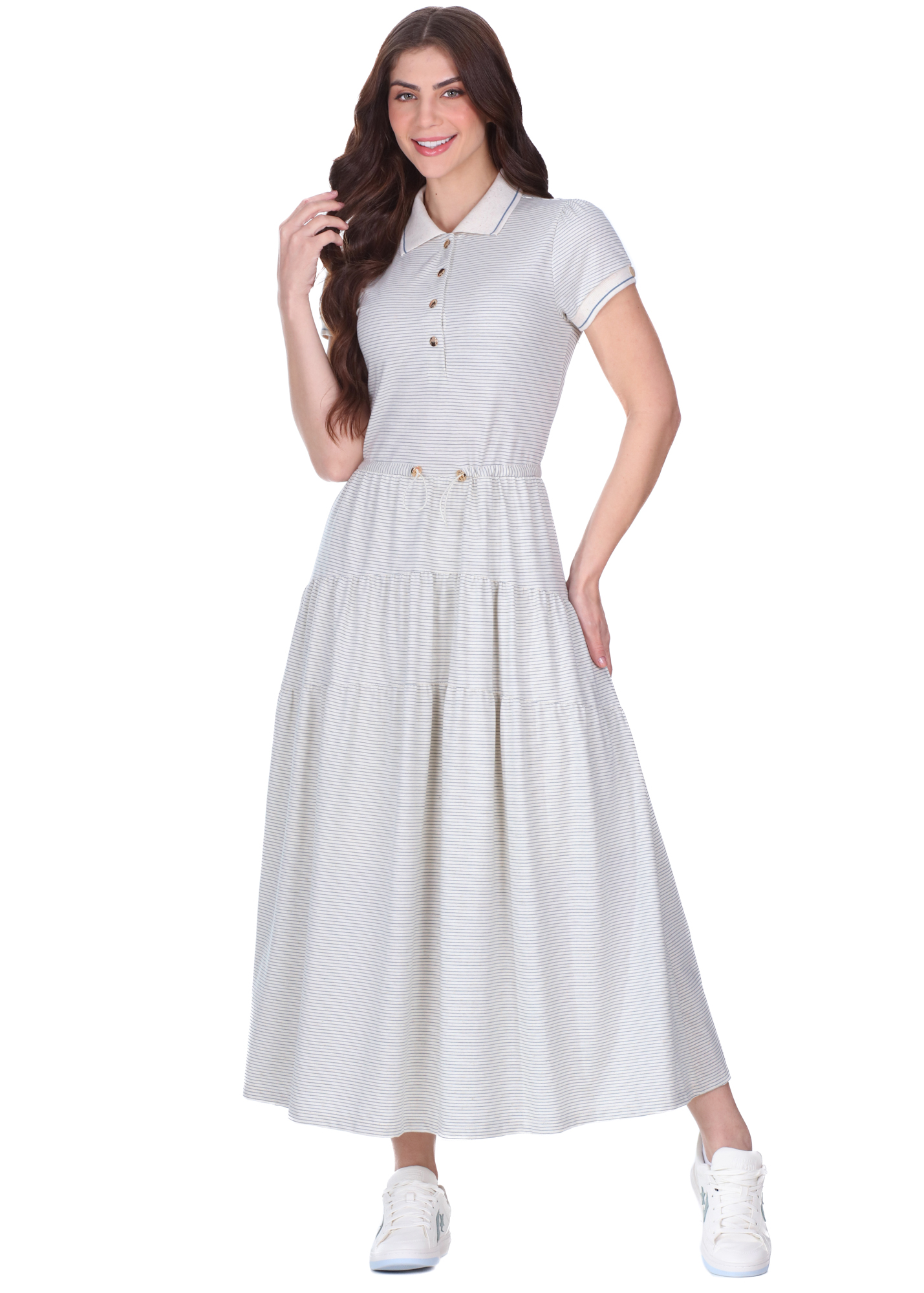O Vestido Hapuk é a escolha perfeita para quem valoriza conforto aliado a um visual moderno e descomplicado. Confeccionado em malha listrada de algodão, poliéster e linho, o modelo oferece toque agradável, leveza e ótimo caimento, ideal para o uso diário.