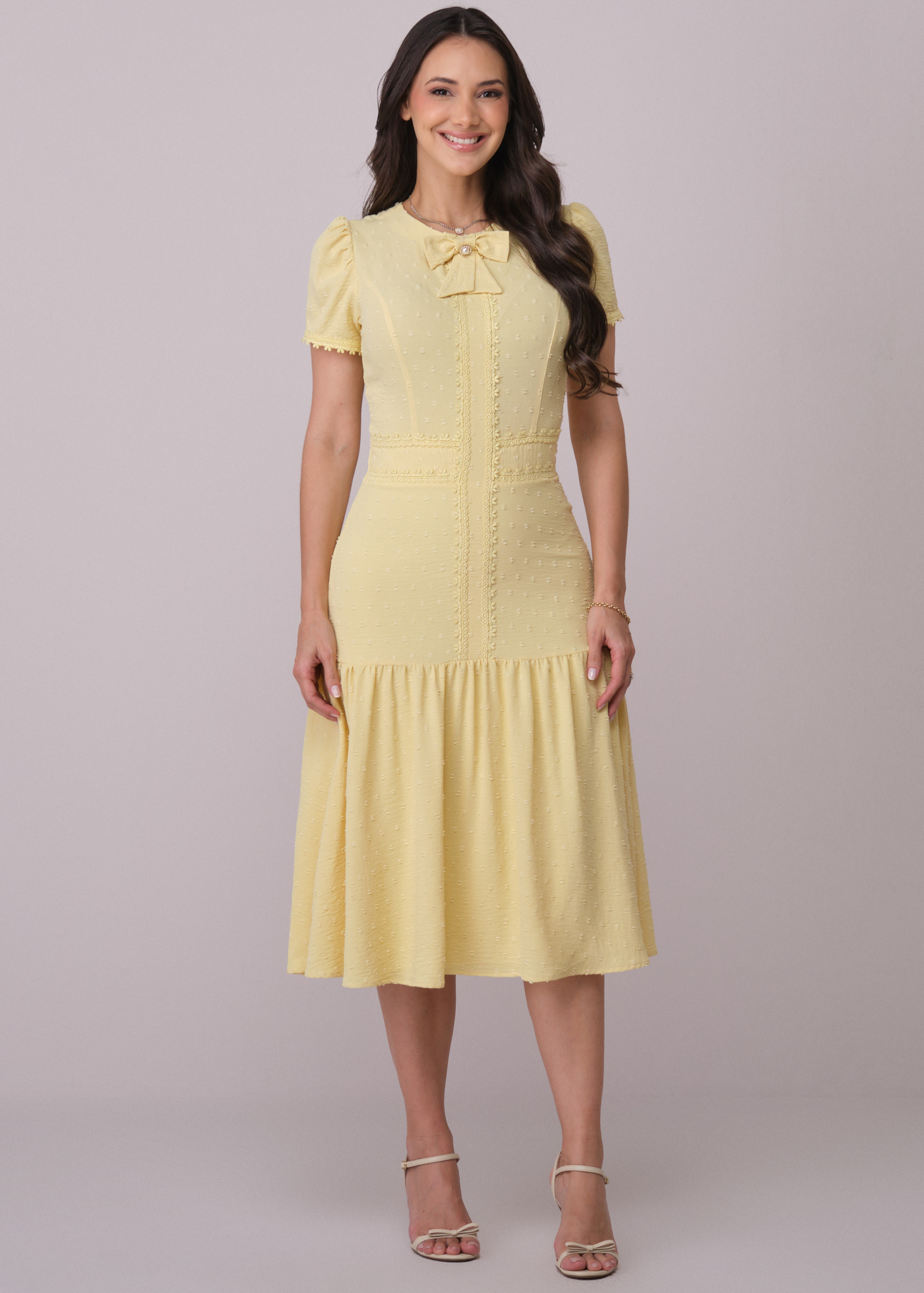 O modelo possui modelagem midi ajustada ao corpo, com recortes estratégicos que destacam a cintura e proporcionam um visual refinado. O decote redondo com aplicação de laço delicado adiciona um toque romântico, enquanto as mangas curtas levemente bufantes completam o design com feminilidade.